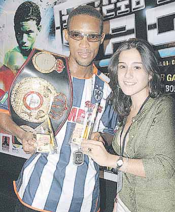 El campeón Celestino "Pelenchín" Caballero, junto a María Cristina de Goytía, ejecutiva de mercadeo de Telecarrier, empresa patrocinadora de la cartelera boxística del pasado viernes 3 de febrero, haciendo entrega de las tarjetas prepagadas "Habla Panamá" a nuestro pugilista, con las que puede realizar sus llamadas a nivel local nacional, internacional, teléfonos públicos y prepago.