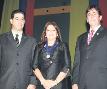 Como cierre de su participación en Expocomer 2008, la Embajada de Colombia presentó la Gala Cultural "Cartagena Caribe Big Band" en el Teatro Anayansi. En la foto Domingo Latorraca, presidente de la Cámara de Comercio; S.E. Gina Benedetti, embajadora de Colombia, y Fernando Arango.