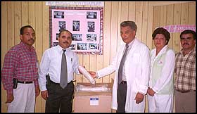 El presidente de la Organización Panameña Antituberculosis, Dr. Elmer Miranda, entregó al Subdirector regional de Salud de Panamá Oeste, Joaquín Chang, una donación de 1,500 envases para hacer los exámenes de la tuberculosis, quien agradeció en nombre de la institución la donación. ¡Enhorabuena!