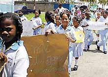 La marcha, que recorrió las calles de la avenida central, era observada con mucha aceptación por parte de la comunidad que veía desfilar a niños pequeños con pancartas pidiendo un alto a la delincuencia y un sí a la paz.