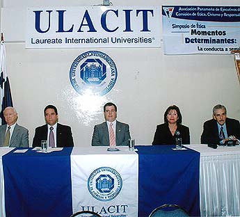 Con la participación de importantes figuras del sector económico, profesional y político, se llevó a cabo el simposio "Momentos Determinantes: Ética, la Conducta a Seguir", organizado por la Comisión de Ética, Civismo y Democracia, de la Asociación Panameña de Ejecutivos de Empresa (APEDE). En el evento participó como uno de sus panelistas, Miguel Moreno, Primer Vicepresidente-Contralor de Bladex, quien disertó sobre el tema Ética y Gobierno Corporativo: una experiencia real en Panamá. De izquierda a derecha: Eduardo Pazmiño, Presidente de la Comisión de Ética, Civismo y Responsabilidad Social de la APEDE; Fernando Eleta A., primer Presidente y fundador de la APEDE; Miguel Moreno, Primer Vicepresidente y Contralor de (Bladex); Enrique Arturo de Obarrio, Presidente de la APEDE; Noemí Castillo, Rectora de la ULACIT y John Bennett N., Expresidente de la APEDE.