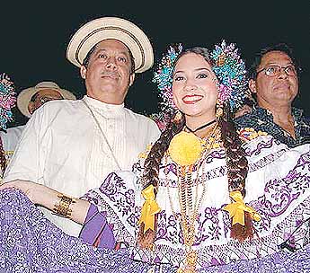 La abanderada de La Montuna, Srta. Ambar Gisela Zambrano Cárdenas, posa junto a su padre, el Dr. Manuel Zambrano, durante la tuna de la montuna que recorrió en la noche las calles de Guararé. Ambar Gisela, recibió de la reina del Festival de La Mejorana, Massiel Inés Montenegro, la bandera y de inmediato con su tuna hizo su recorrido por las calles de Guararé, repletas de amantes del festival.