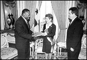 En fecha reciente el nuevo Embajador de Grenada, Denis Antoine, presentó sus Cartas Credenciales a la Mandataria panameña, Mireya Moscoso, durante acto realizado en el Salón Amarillo del Palacio de Las Garzas. S.E. Antoine expresó su satisfacción al ser enviado a Panamá como representante de su país. ¡Enhorabuena!