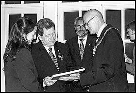 El primer vicepresidente de la República, Arturo Vallarino entrega al Alcalde Mayor de la ciudad de Hannover, Alemania, un libro que contiene la historia sobre la construcción del Canal de Panamá durante su visita a este ayuntamiento con motivo de su participación en la Expo 2000.