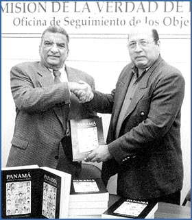 Recientemente, la Comisión de la Verdad de Panamá, recibió dos mil 500 ejemplares del Informe Final “... la verdad os hará libres”, con el objeto de continuar con el plan de Divulgación Nacional de este documento, cuya distribución es gratuita pero también está a la venta en las principales librerías del país. (más información al 232-6202 y 232-6210). En la gráfica observamos al licenciado Angel Jaén, Presidente de Formularios Continuos, S. A. Y al licenciado Alberto Almanza, director general de la Comisión de la Verdad de Panamá.